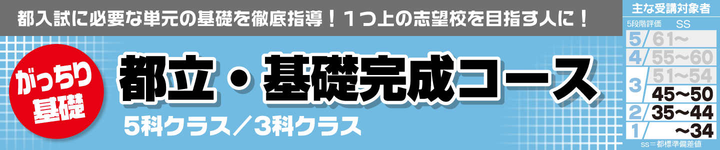 都立高校受験に向けて基礎固めをしっかりしたい人に最適なコースです。主任講師によるポイントを押さえた一斉授業と、1クラス2名以上(英語・数学について)の先生による巡回個別指導との効果的な組み合わせで、都入試突破に必要な基礎力をガッチリつけます。