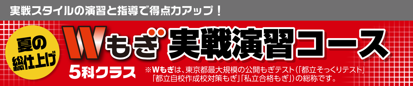 Wもぎの新教育だからこそできる特別演習コースです。都入試を徹底分析して作った「都立そっくりもぎ(過年度実施版)」をテキストとして使用した『演習+解説指導』で「得点力」をつけます。